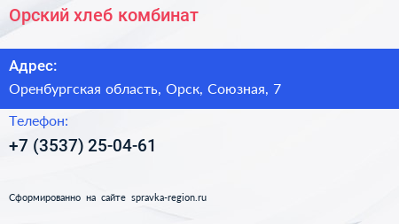Орский хлеб, комбинат по адресу Оренбургская область, Орск, Союзная, 7 в дальнейшем Организация, размещена в следующих категориях: