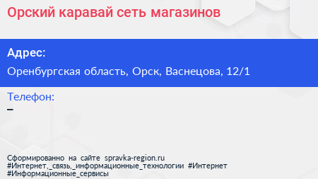 Орский каравай, сеть магазинов по адресу Оренбургская область, Орск, Васнецова, 12/1 в дальнейшем Организация, размещена в следующих категориях: