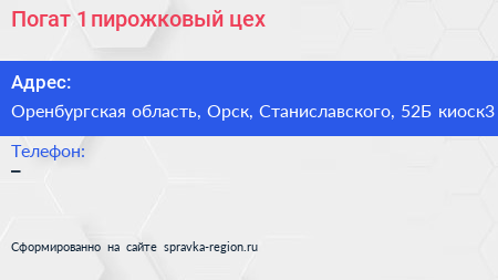 Погат-1, пирожковый цех по адресу Оренбургская область, Орск, Станиславского, 52Б киоск3 в дальнейшем Организация, размещена в следующих категориях: