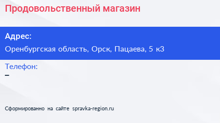 Продовольственный магазин по адресу Оренбургская область, Орск, Пацаева, 5 к3 в дальнейшем Организация, размещена в следующих категориях: