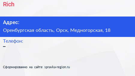 Rich по адресу Оренбургская область, Орск, Медногорская, 18 в дальнейшем Организация, размещена в следующих категориях: