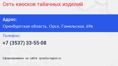 Сеть киосков табачных изделий по адресу Оренбургская область, Орск, Гомельская, 69в в дальнейшем Организация, размещена в следующих категориях: