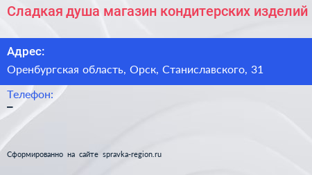 Сладкая душа, магазин кондитерских изделий по адресу Оренбургская область, Орск, Станиславского, 31 в дальнейшем Организация, размещена в следующих категориях: