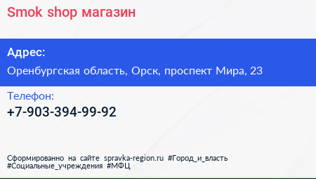 Smok shop, магазин по адресу Оренбургская область, Орск, проспект Мира, 23 в дальнейшем Организация, размещена в следующих категориях:
