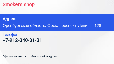 Smokers shop по адресу Оренбургская область, Орск, проспект Ленина, 128 в дальнейшем Организация, размещена в следующих категориях: