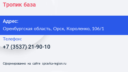 Тропик, база по адресу Оренбургская область, Орск, Короленко, 106/1 в дальнейшем Организация, размещена в следующих категориях: