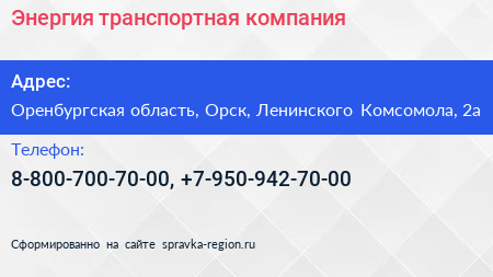 Энергия, транспортная компания по адресу Оренбургская область, Орск, Ленинского Комсомола, 2а в дальнейшем Организация, размещена в следующих категориях: