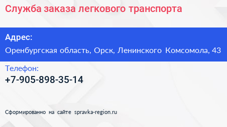 Служба заказа легкового транспорта по адресу Оренбургская область, Орск, Ленинского Комсомола, 43 в дальнейшем Организация, размещена в следующих категориях: