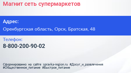 Магнит, сеть супермаркетов по адресу Оренбургская область, Орск, Братская, 48 в дальнейшем Организация, размещена в следующих категориях: