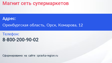 Магнит, сеть супермаркетов по адресу Оренбургская область, Орск, Комарова, 12 в дальнейшем Организация, размещена в следующих категориях: