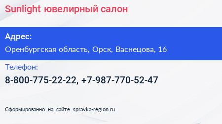 Sunlight, ювелирный салон по адресу Оренбургская область, Орск, Васнецова, 16 в дальнейшем Организация, размещена в следующих категориях: