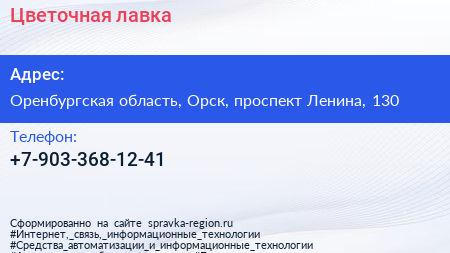 Цветочная лавка по адресу Оренбургская область, Орск, проспект Ленина, 130 в дальнейшем Организация, размещена в следующих категориях: