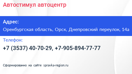 Автостимул, автоцентр по адресу Оренбургская область, Орск, Днепровский переулок, 14а в дальнейшем Организация, размещена в следующих категориях: