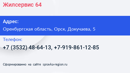 Жилсервис 64 по адресу Оренбургская область, Орск, Докучаева, 5 в дальнейшем Организация, размещена в следующих категориях: