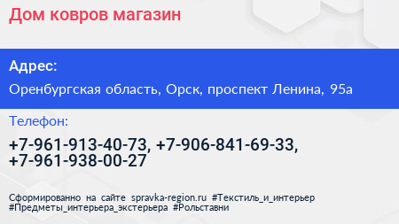 Дом ковров, магазин по адресу Оренбургская область, Орск, проспект Ленина, 95а в дальнейшем Организация, размещена в следующих категориях: