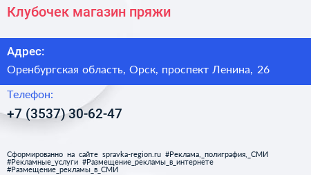 Клубочек, магазин пряжи по адресу Оренбургская область, Орск, проспект Ленина, 26 в дальнейшем Организация, размещена в следующих категориях: