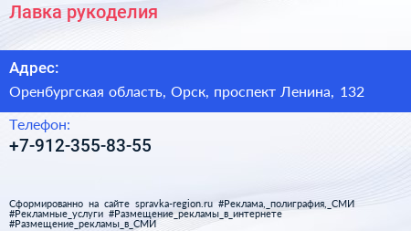 Лавка рукоделия по адресу Оренбургская область, Орск, проспект Ленина, 132 в дальнейшем Организация, размещена в следующих категориях: