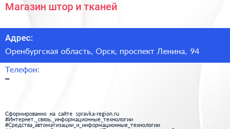 Магазин штор и тканей по адресу Оренбургская область, Орск, проспект Ленина, 94 в дальнейшем Организация, размещена в следующих категориях: