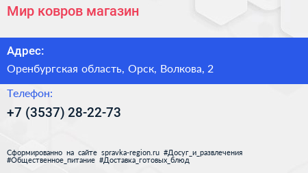 Мир ковров, магазин по адресу Оренбургская область, Орск, Волкова, 2 в дальнейшем Организация, размещена в следующих категориях: