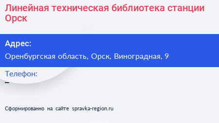 Линейная техническая библиотека станции Орск по адресу Оренбургская область, Орск, Виноградная, 9 в дальнейшем Организация, размещена в следующих категориях: