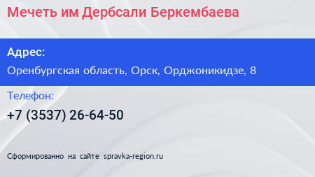 Мечеть им. Дербсали Беркембаева по адресу Оренбургская область, Орск, Орджоникидзе, 8 в дальнейшем Организация, размещена в следующих категориях: