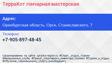 ТерраКот, гончарная мастерская по адресу Оренбургская область, Орск, Станиславского, 7 в дальнейшем Организация, размещена в следующих категориях: