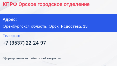 КПРФ, Орское городское отделение по адресу Оренбургская область, Орск, Радостева, 13 в дальнейшем Организация, размещена в следующих категориях: