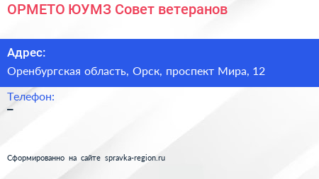 ОРМЕТО-ЮУМЗ, Совет ветеранов по адресу Оренбургская область, Орск, проспект Мира, 12 в дальнейшем Организация, размещена в следующих категориях:
