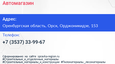 Автомагазин по адресу Оренбургская область, Орск, Орджоникидзе, 153 в дальнейшем Организация, размещена в следующих категориях: