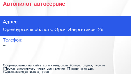 Автопилот, автосервис по адресу Оренбургская область, Орск, Энергетиков, 26 в дальнейшем Организация, размещена в следующих категориях: