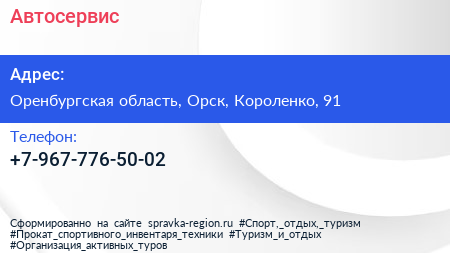 Автосервис по адресу Оренбургская область, Орск, Короленко, 91 в дальнейшем Организация, размещена в следующих категориях: