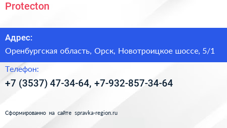 Protecton по адресу Оренбургская область, Орск, Новотроицкое шоссе, 5/1 в дальнейшем Организация, размещена в следующих категориях: