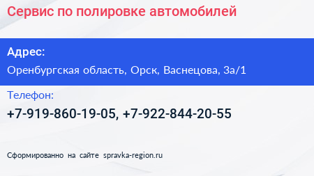 Сервис по полировке автомобилей по адресу Оренбургская область, Орск, Васнецова, 3а/1 в дальнейшем Организация, размещена в следующих категориях: