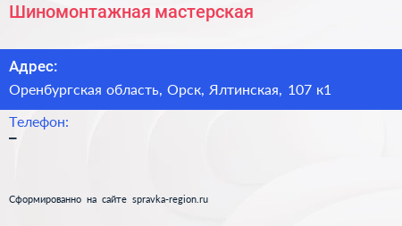 Шиномонтажная мастерская по адресу Оренбургская область, Орск, Ялтинская, 107 к1 в дальнейшем Организация, размещена в следующих категориях: