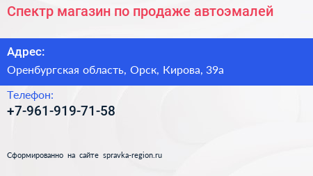 Спектр, магазин по продаже автоэмалей по адресу Оренбургская область, Орск, Кирова, 39а в дальнейшем Организация, размещена в следующих категориях: