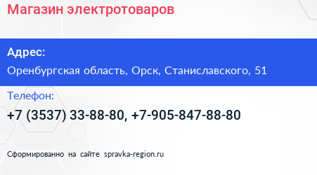 Магазин электротоваров по адресу Оренбургская область, Орск, Станиславского, 51 в дальнейшем Организация, размещена в следующих категориях: