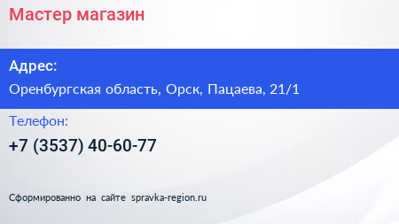 Мастер, магазин по адресу Оренбургская область, Орск, Пацаева, 21/1 в дальнейшем Организация, размещена в следующих категориях: