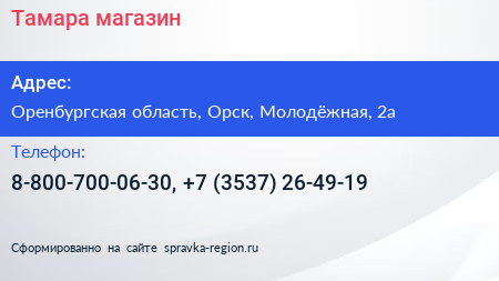 Тамара, магазин по адресу Оренбургская область, Орск, Молодёжная, 2а в дальнейшем Организация, размещена в следующих категориях: