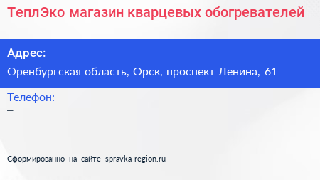 ТеплЭко, магазин кварцевых обогревателей по адресу Оренбургская область, Орск, проспект Ленина, 61 в дальнейшем Организация, размещена в следующих категориях: