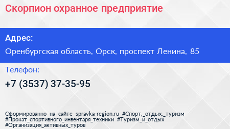 Скорпион, охранное предприятие по адресу Оренбургская область, Орск, проспект Ленина, 85 в дальнейшем Организация, размещена в следующих категориях: