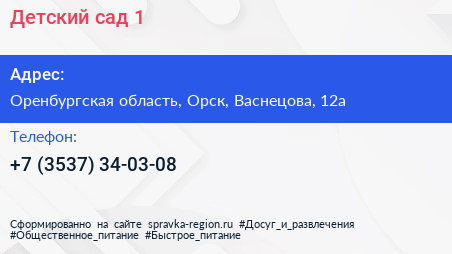 Детский сад №1 по адресу Оренбургская область, Орск, Васнецова, 12а в дальнейшем Организация, размещена в следующих категориях: