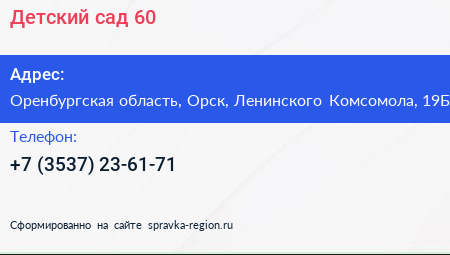 Детский сад №60 по адресу Оренбургская область, Орск, Ленинского Комсомола, 19Б в дальнейшем Организация, размещена в следующих категориях: