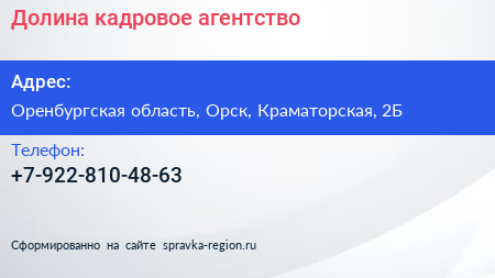 Долина, кадровое агентство по адресу Оренбургская область, Орск, Краматорская, 2Б в дальнейшем Организация, размещена в следующих категориях: