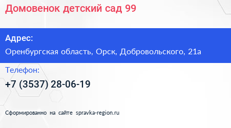 Домовенок, детский сад №99 по адресу Оренбургская область, Орск, Добровольского, 21а в дальнейшем Организация, размещена в следующих категориях: