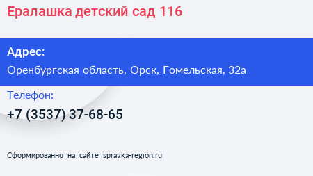 Ералашка, детский сад №116 по адресу Оренбургская область, Орск, Гомельская, 32а в дальнейшем Организация, размещена в следующих категориях: