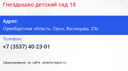 Гнездышко, детский сад №18 по адресу Оренбургская область, Орск, Васнецова, 23а в дальнейшем Организация, размещена в следующих категориях: