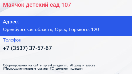 Маячок, детский сад №107 по адресу Оренбургская область, Орск, Горького, 120 в дальнейшем Организация, размещена в следующих категориях: