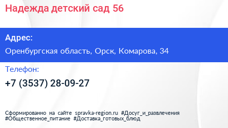 Надежда, детский сад №56 по адресу Оренбургская область, Орск, Комарова, 34 в дальнейшем Организация, размещена в следующих категориях: