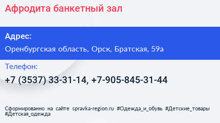 Афродита, банкетный зал по адресу Оренбургская область, Орск, Братская, 59а в дальнейшем Организация, размещена в следующих категориях: