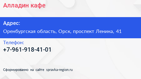 Алладин, кафе по адресу Оренбургская область, Орск, проспект Ленина, 41 в дальнейшем Организация, размещена в следующих категориях: